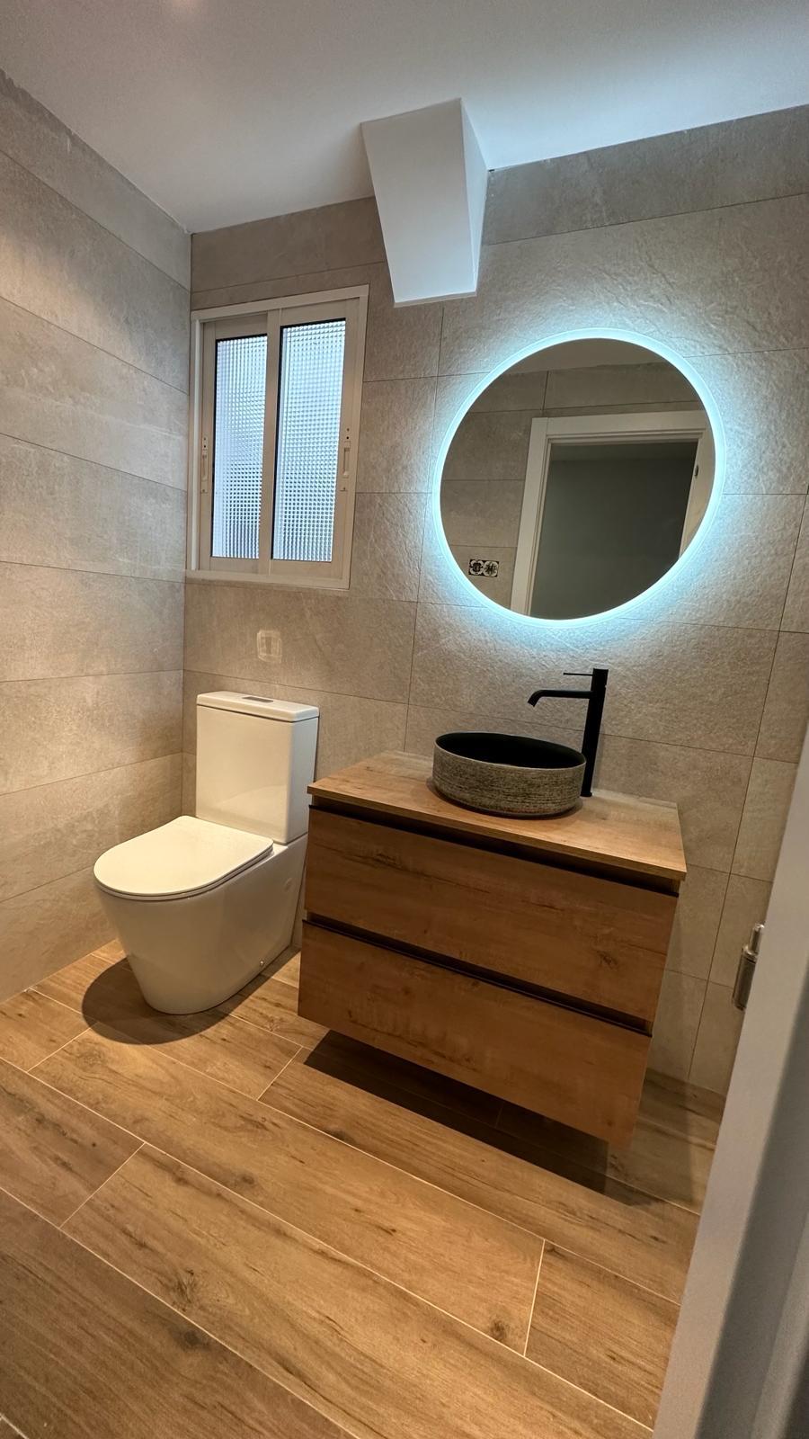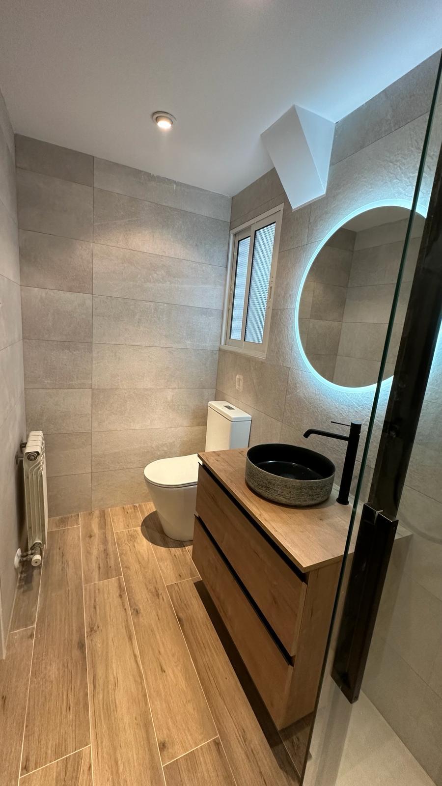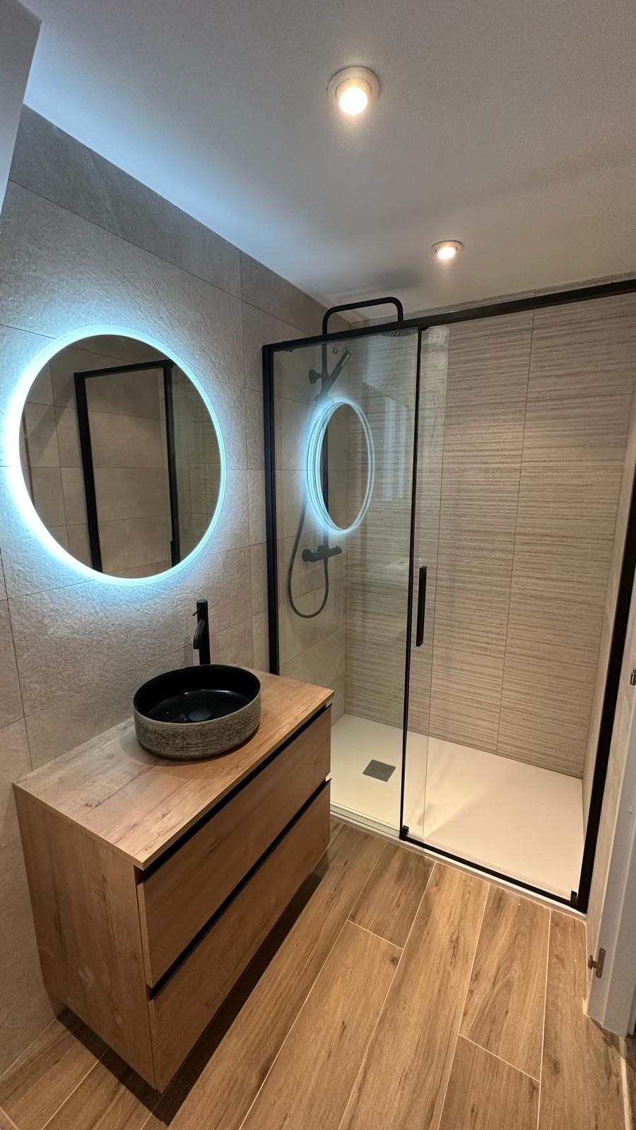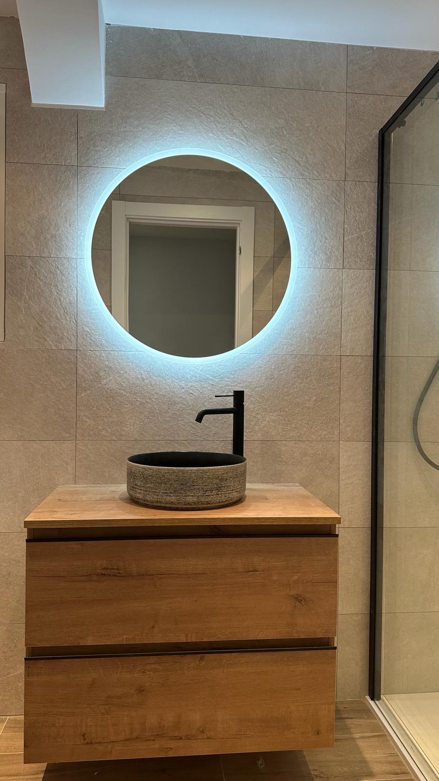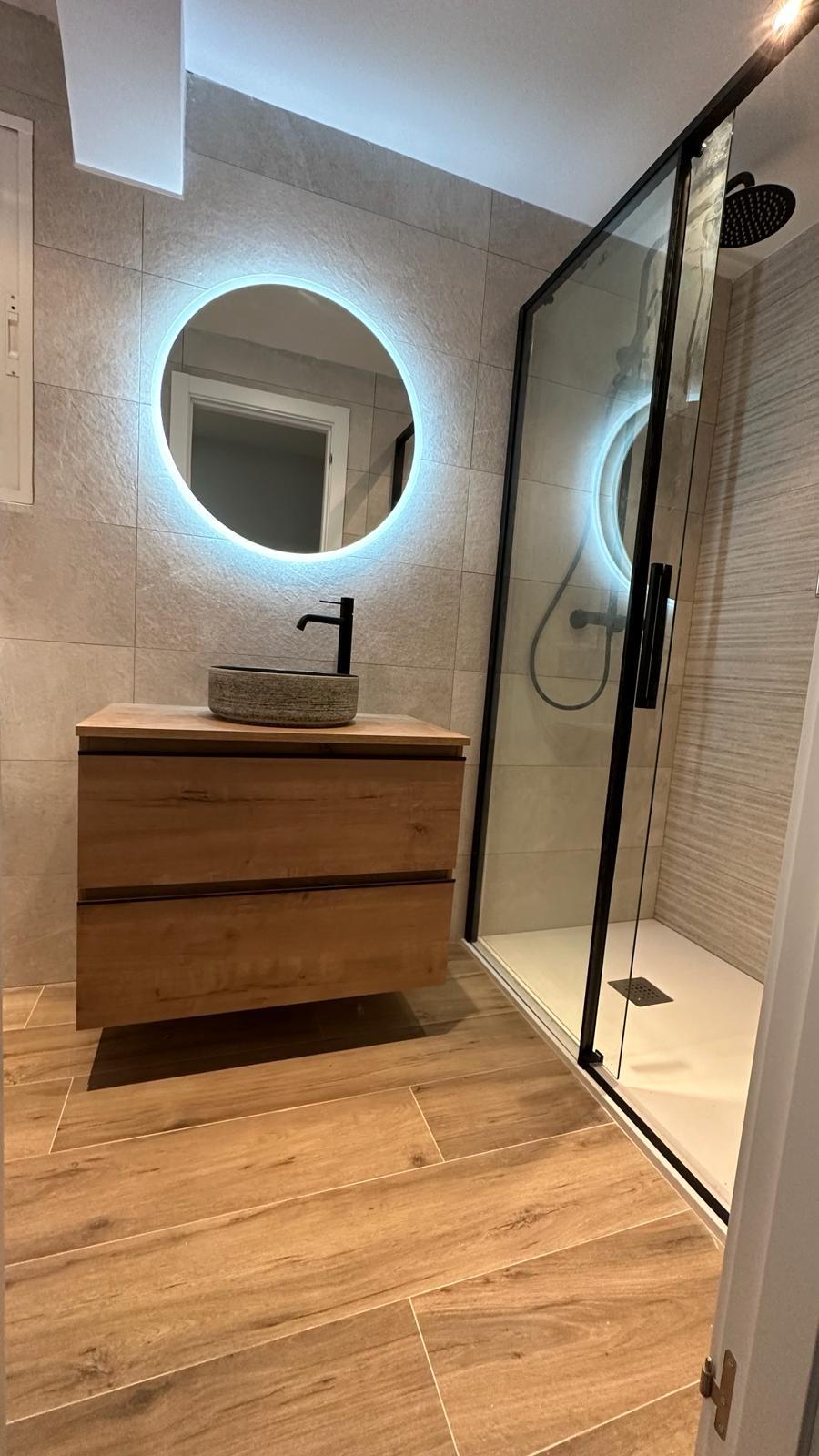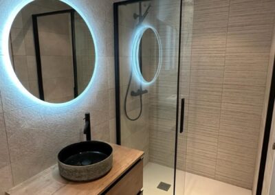 A nivel estético, hemos apostado por un diseño moderno y atemporal. Las paredes están revestidas con azulejos porcelánicos de gran formato en tonos neutros y grises claros, creando un contraste muy elegante con la grifería termostática en acabado negro mate. Para aportar calidez visual al conjunto, instalamos un mueble de lavabo suspendido con acabado en madera de roble natural, coronado por un espejo con luz LED perimetral que evita las sombras molestas en el rostro.